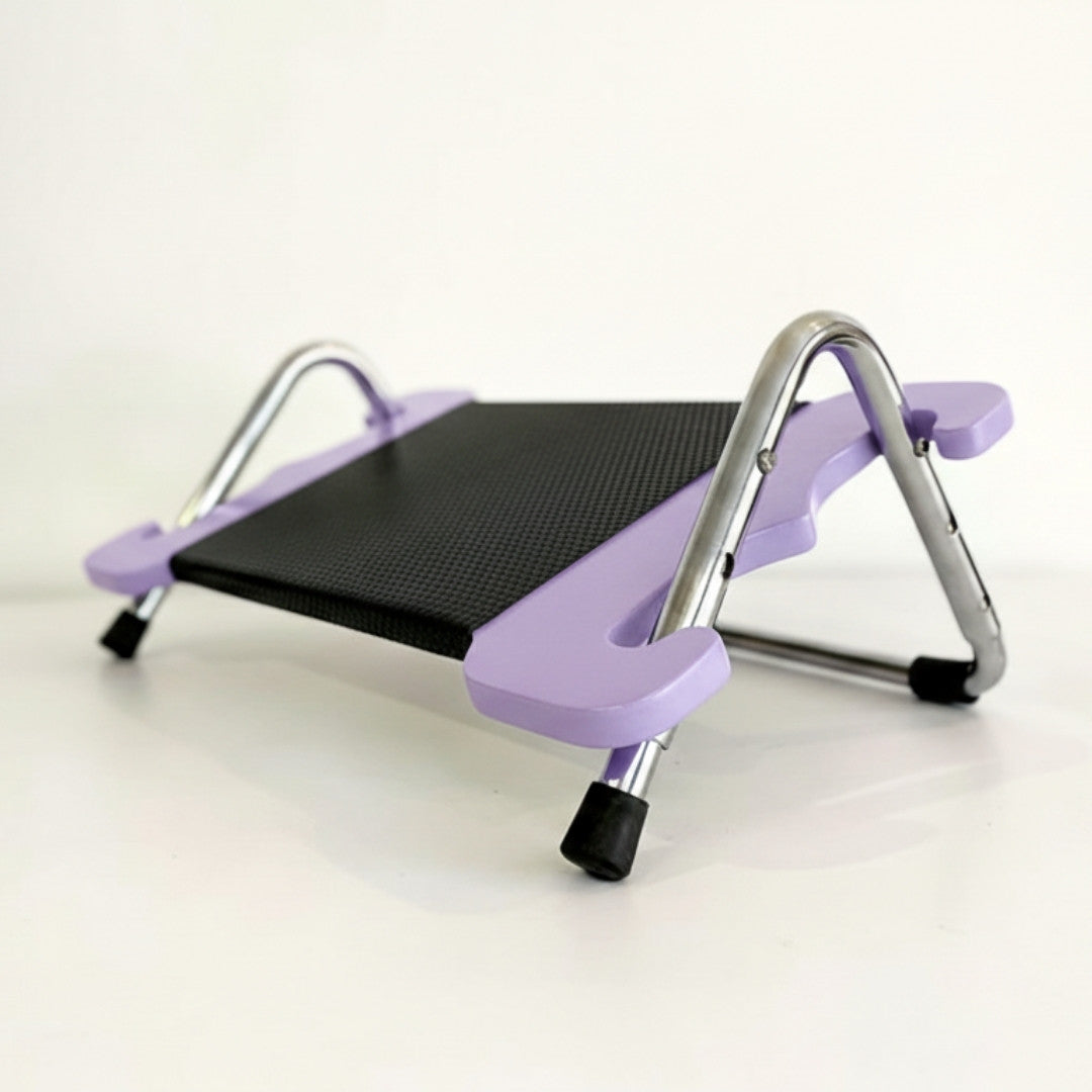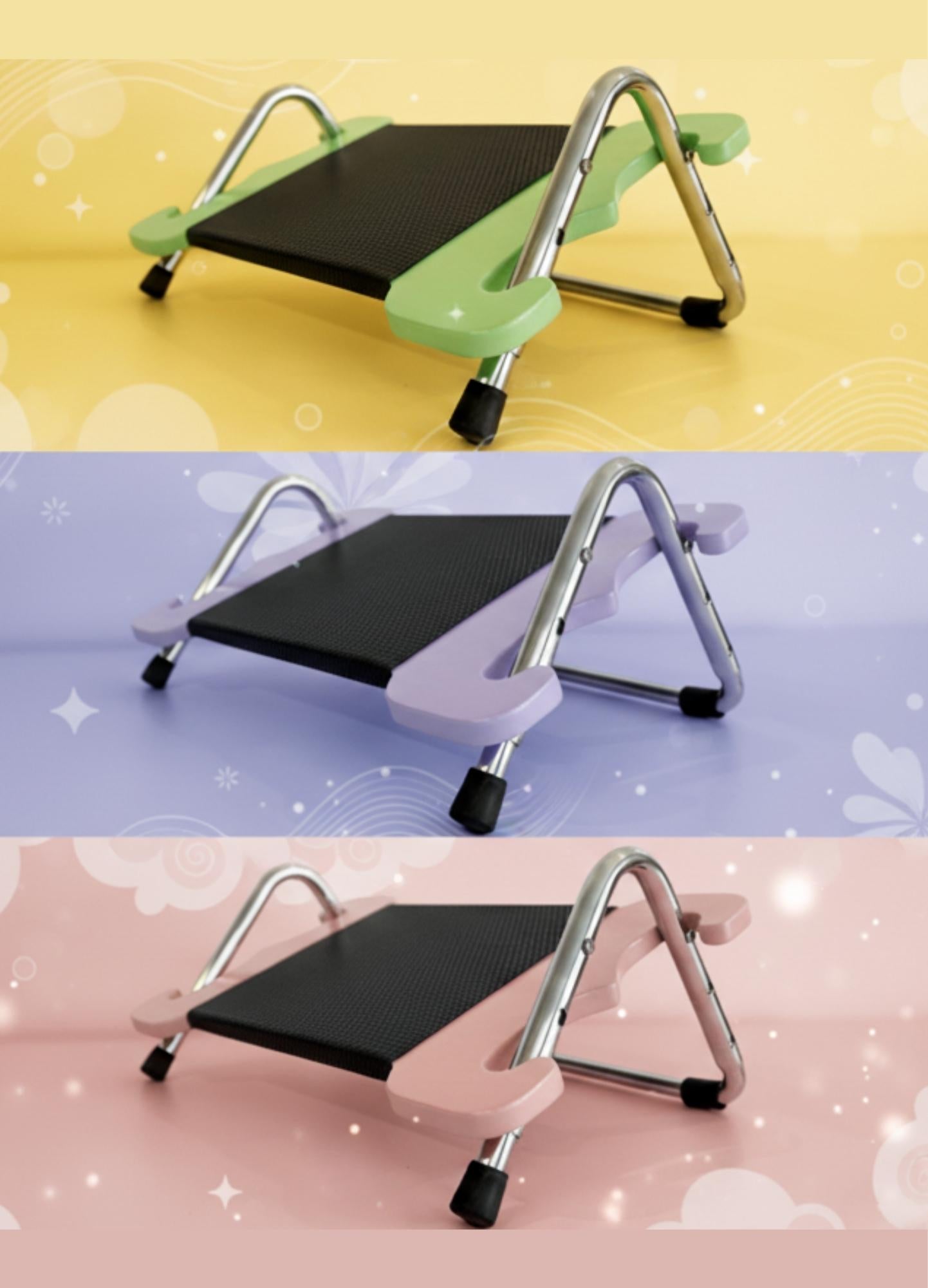 El descansapiés tiene superficie antideslizante y base con topes de caucho que aseguran grip incluso en pisos lisos.